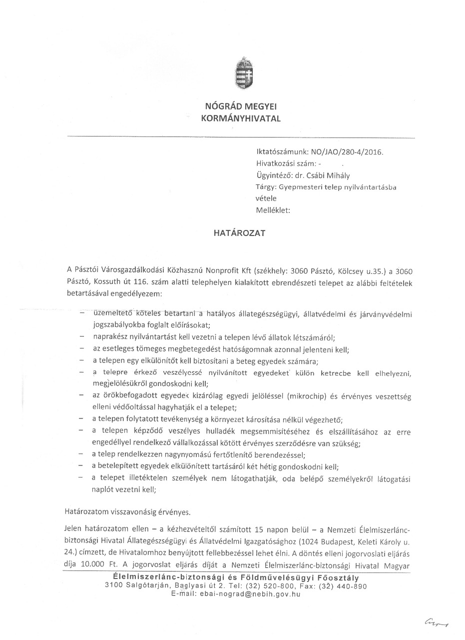 Ezúttal szeretném közölni, hogy a Gyepmesteri Telep működése 2017-ben megszűnt. Befogott állatokkal kapcsolatban érdeklődni az EBFARM Kft-nél lehet (https://www.ebfarm.eoldal.hu/), illetve a kóbor kutyák befogását is Ők végzik, a vezető Sipos József ebrendész.